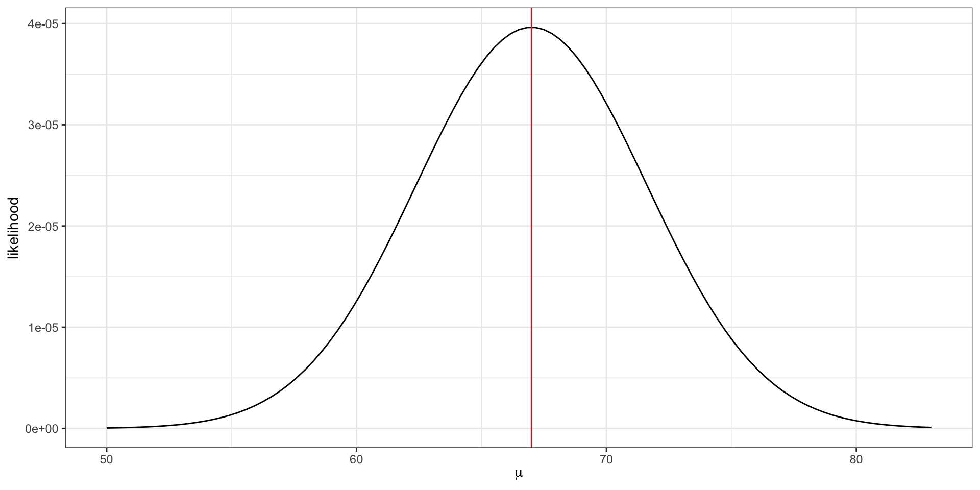 The maximum likelihood estimate \(\hat{\mu} = \frac{75 + 58 + 68}{3} = 67\).