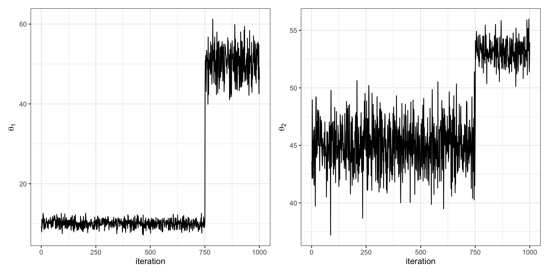 We construct a Gibbs sampler and look at the trace plots of \(\theta_1\) and \(\theta_2\), produced below. Chat with your neighbor, describe what you observe. Has the chain converged for each parameter? How well is the sampler mixing? Do you think the parameters are correlated or uncorrelated?
