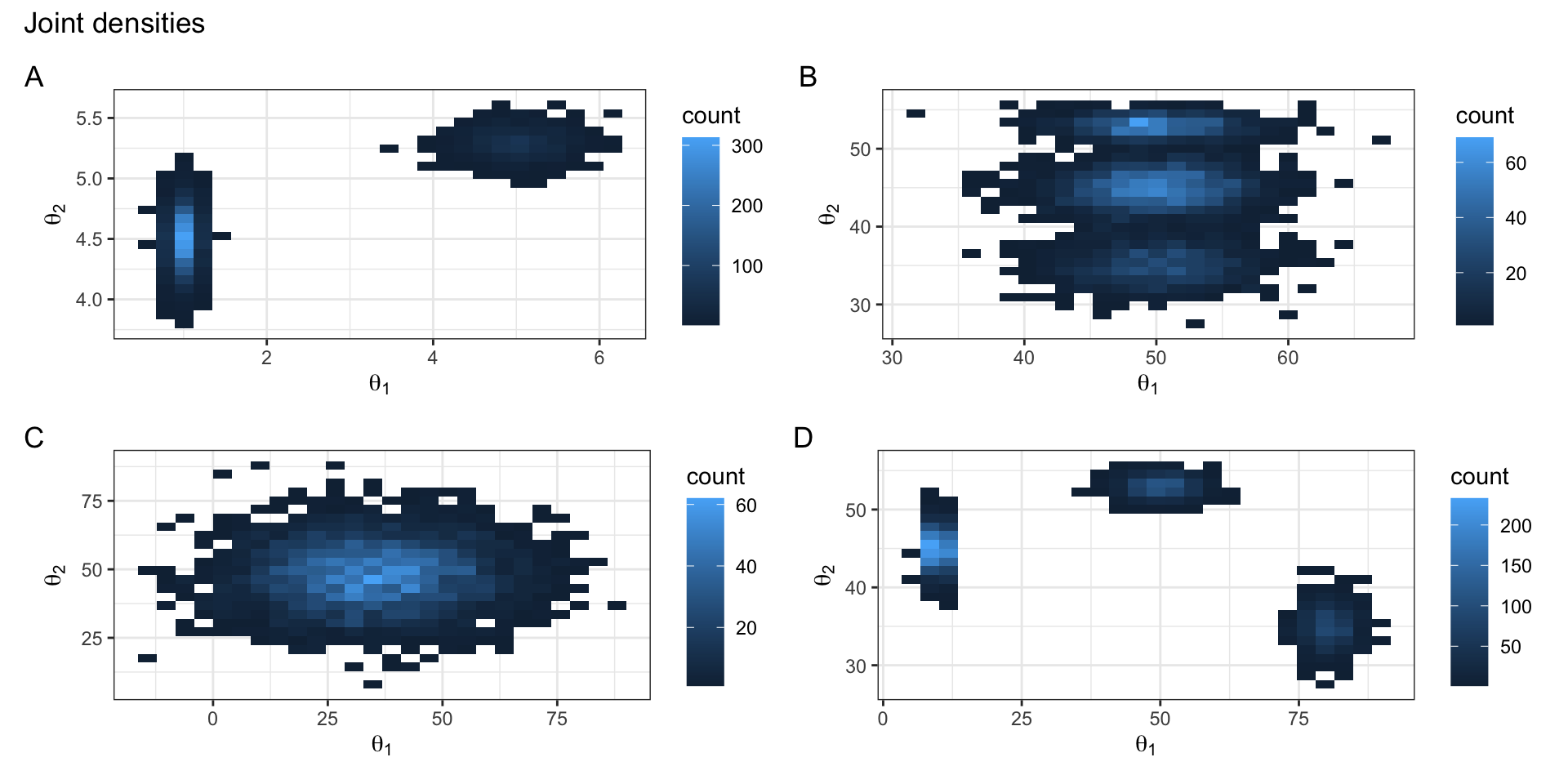 Based on the first 1000 iterations of your Gibbs sampler shown on the previous slide, which of the following joint densities is the most plausible for \(\theta_1, \theta_2 | \mathbf{y}\)? Why? Hint: it may help to think about where your sampler starts and imagine a particle moving through space according to conditional updates.
