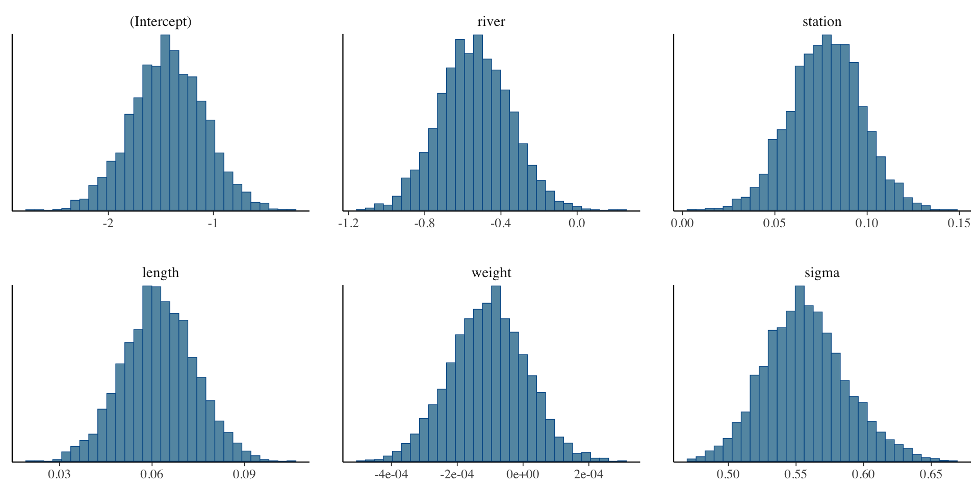 mcmc_trace(model1, pars = c("river", "station")mcmc_hist(model1, pars = "length")To read more about bayesplot functionality, see https://mc-stan.org/bayesplot/articles/plotting-mcmc-draws.html